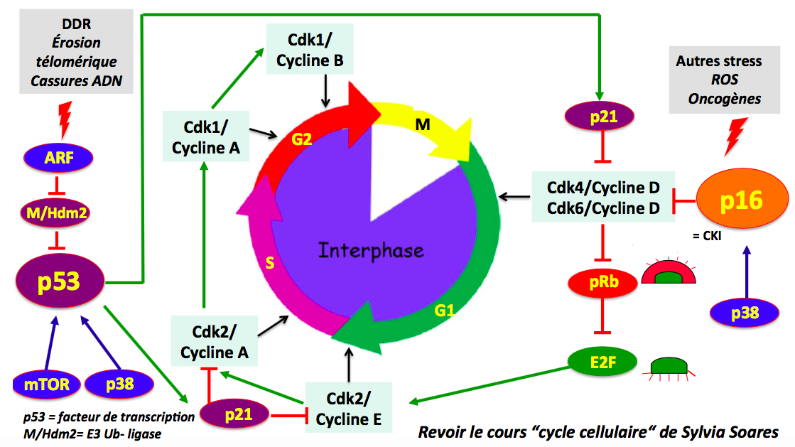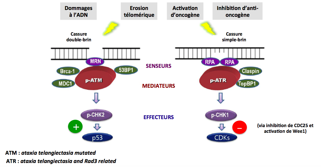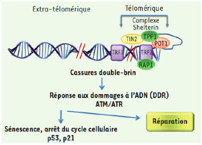 In fine, l’érosion télomérique et les différents stress induisant la sénescence aboutissent à des cassures simple ou double brins de l’ADN. Ces cassures initient la réponse aux dommages de l’ADN: DDR (DNA Damage Response)
