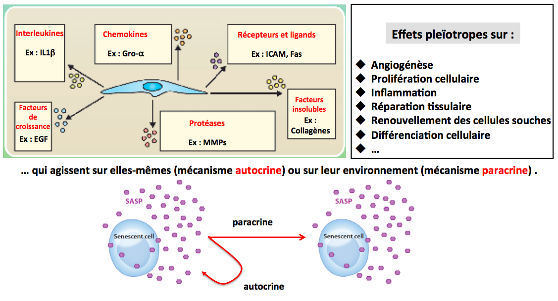 Le SASP (Senescence-Associated Secretory Phenotype) correspond aux molécules sécrétées par une cellules en sénescence. Il est souvent pro-inflamatoire.