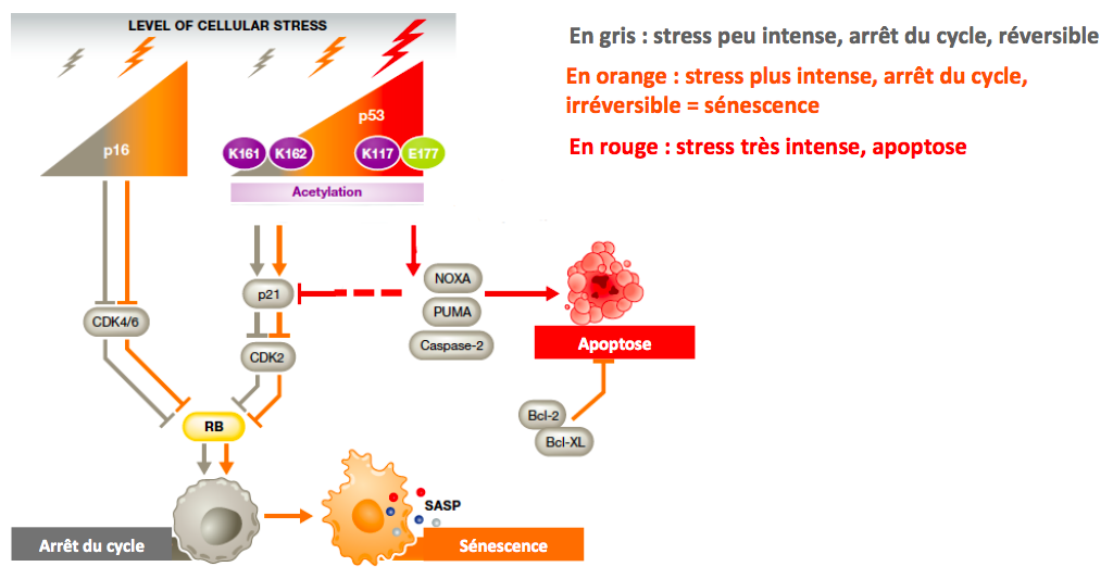 Le “choix“ d’une cellule entre arrêt du cycle, sénescence ou apoptose dépend de nombreux facteurs, mais principalement de l’intensité du stress et du type cellulaire.
