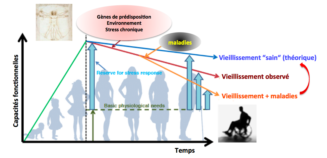 Le vieillissement n’est pas en soi une “maladie“, mais la conséquence de la sénescence cellulaire, tissulaire et de l’organisme. Chaque individu vieilli en fonction de son patrimoine génétique, de l’environnement et des stress subis. Les maladies viennent modifier et perturber cette trajectoire. Leur fréquence augmente avec l’âge.
