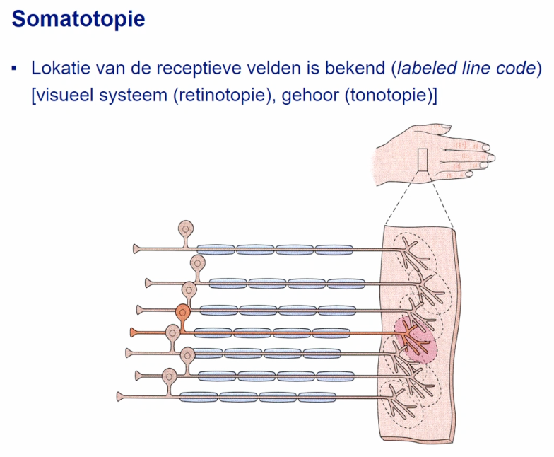 Organisatie van de sensibele schors= homunculus. Hierin wordt weergegeven hoe uitgebreid het receptieve veld is voor een bepaald lichaamsdeel. Mond, handen en aangezicht bevatten het meeste zenuwen