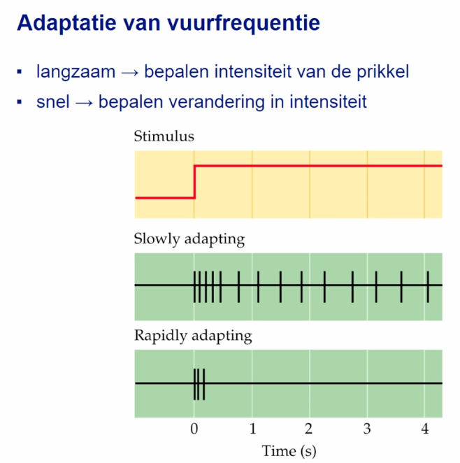 langzaam: geven de absolute waarde van een prikkel. De actiepotentiaal zal blijven vuren zolang het signaal op een andere sterkte is. Bij verandering is vuren snel, als deze verandering blijft, wordt het vuren langzamer. Langzame adaptatie vindt plaats bij pijnreceptoren