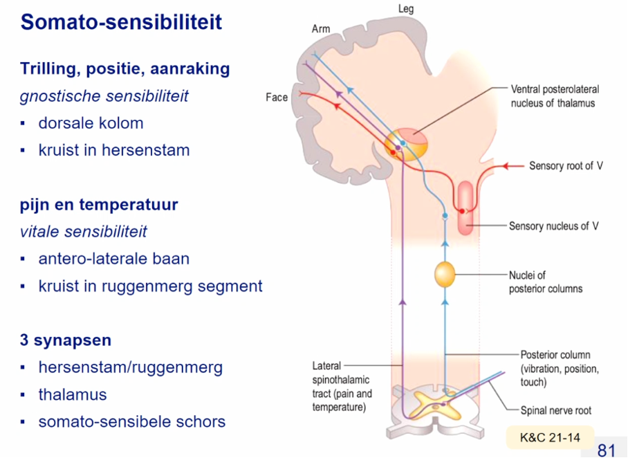 Vitale synaps zit in het ruggenmerg (dorsale hoorn) en deze kruist ook in het ruggenmerg