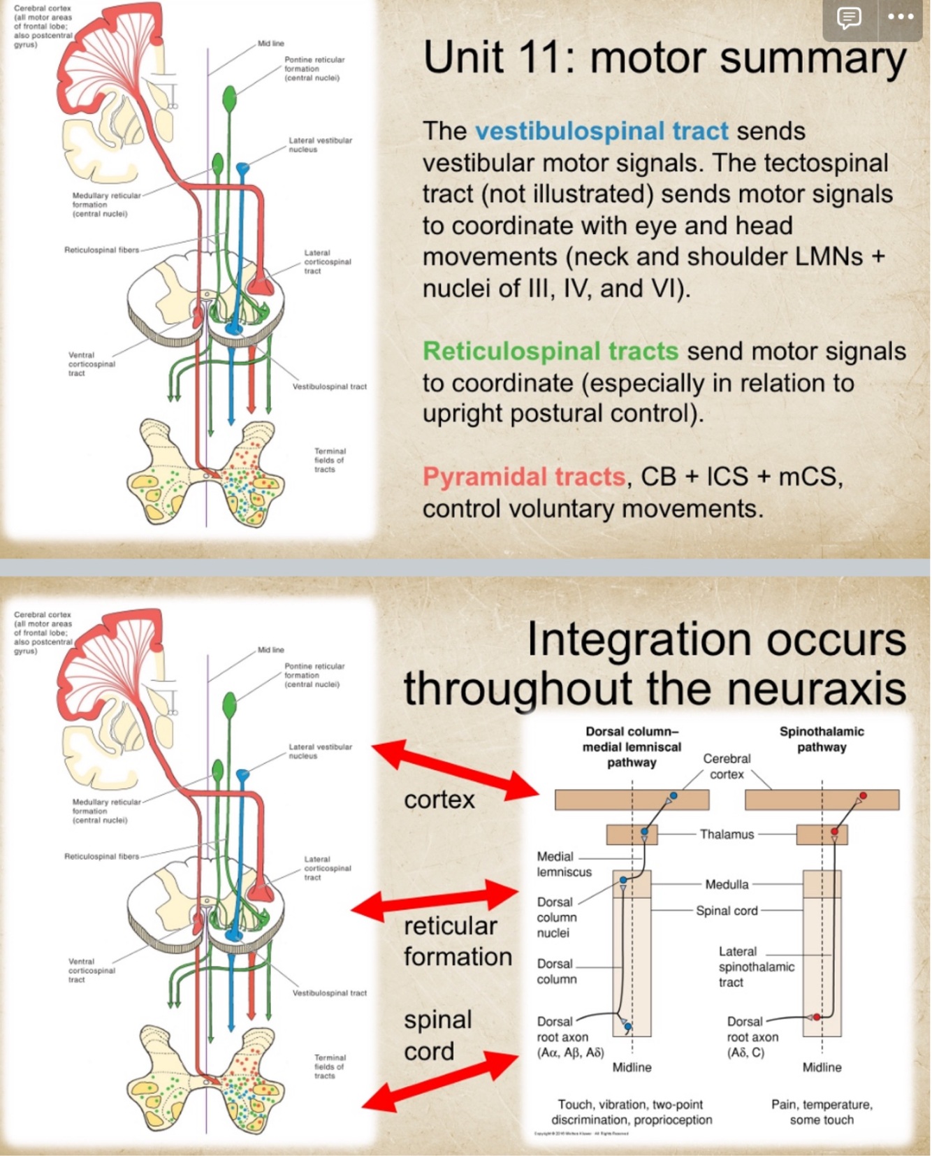 How do the motor pathways integrate with DCML and spinothalamic?