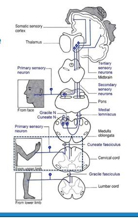 cell bodies are either in dorsal root ganglia (for body) or trigeminal ganglia (for face) info from lower limb goes to lumbar region via primary neurone and goes up via GRACILE FASCICULUS, info from upper limb goes to cervical region and goes up to medulla via CUNEATE FASCICULUS info then goes to gracile and cuneate nuclei, secondary neurone forms and crosses over at medulla to form medial leminiscus, which goes up to thalamus, which then goes to somatosensory cortex via tertiary neurone