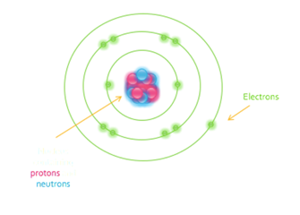 A positively charged nucleus (protons and neutrons) orbited by negatively charged electrons