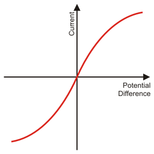 As the current increases the temperature of the filament lamp increases (so the resistance increases) meaning less current can flow per unit potential difference.