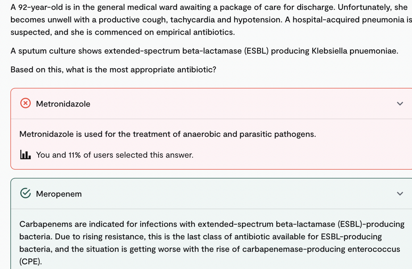 A 92-year-old is in the general medical ward awaiting a package of care for discharge. Unfortunately, she becomes unwell with a productive cough, tachycardia and hypotension. A hospital-acquired pneumonia is suspected, and she is commenced on empirical antibiotics.