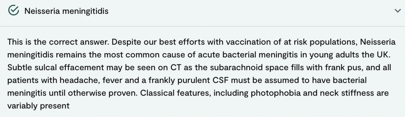 A 22 year old man presented to the emergency department of his local hospital complaining of progressively worsening bilateral headache over 2 days. He tells you that he does not normally suffer from headaches and is otherwise fit and well. On examination, he is febrile at 38.4, but there is no associated focal neurological features, neck stiffness or rash, and he denies photophobia.