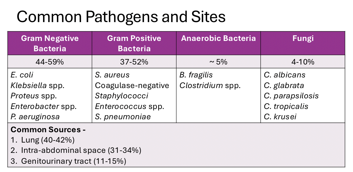 What are the common pathogens and sites of sepsis
