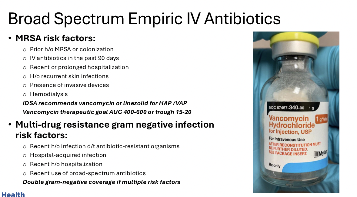 Tell me about broad spectrum empiric IV antibiotics and MRSA/MDR gram neg. (2)