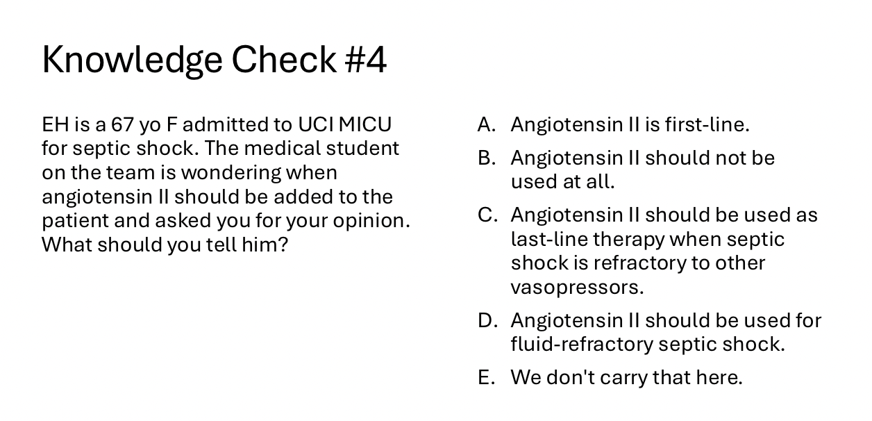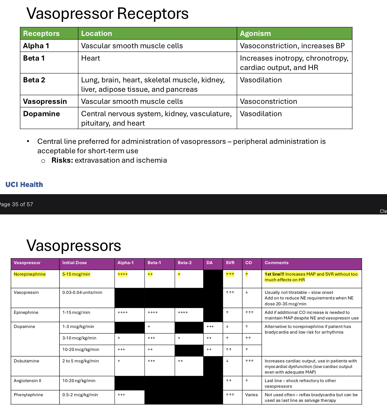 1st line is Norepi (NE) 2nd is Vasopressin but add on to reduce NE requirements never use as monotherapy