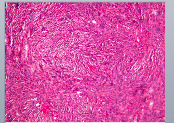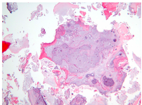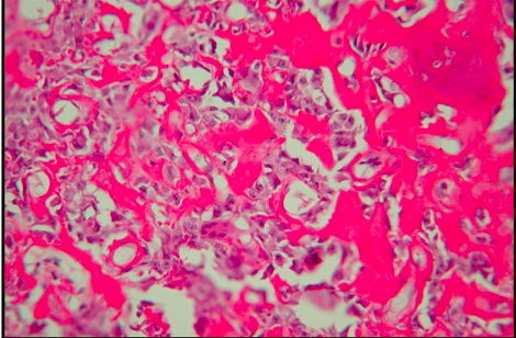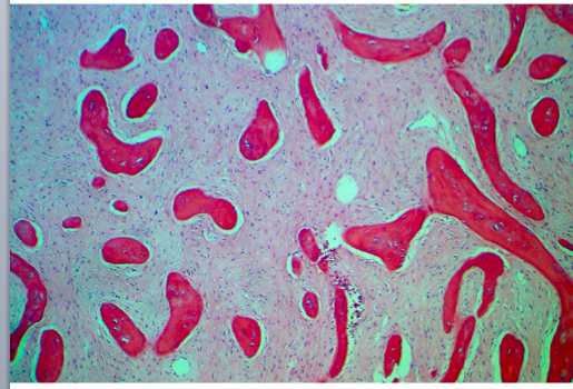Randomly orientated woven bone “chinese characters” surrounded by fibroblast stroma