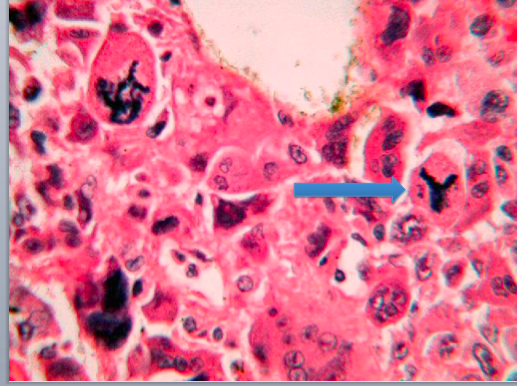 Cells in osteoid irregular, tripolar mitosis