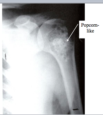 Imagining: medullary calcifications, cortical erosion/destruction, “popcorn”