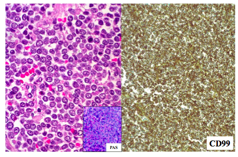 Small round blue cells with neural phenotype and glycogen that stain with CD99; no bone/cartilage matrix