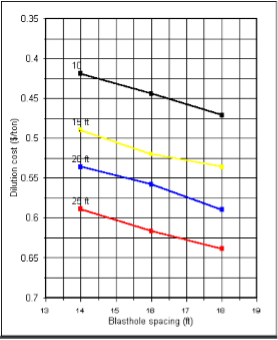 The change from 20 ft to 25 ft benches at 16 ft blasthole spacing has an expected cost of dilution at 0.07$ and operational savings were estimated at 0.04$. Conclusion: Don’t do it you will be losing 0.03$ per ton.
