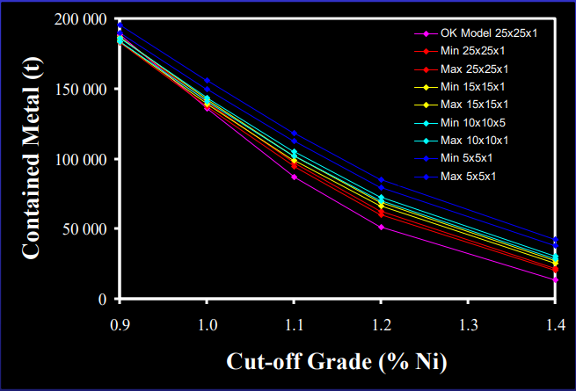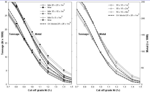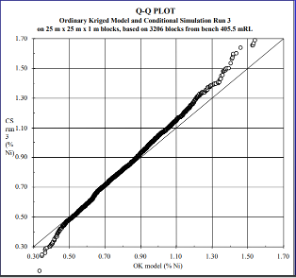 Here, kriging overestimates lower grades and conditional simulations overestimates higher end. This is due to the smoothing effect of the traditional OK model. Similarly due to smoothing, the OK model curve is higher at lower grades and lower at higher grades than the simulated blocks because of smoothing.