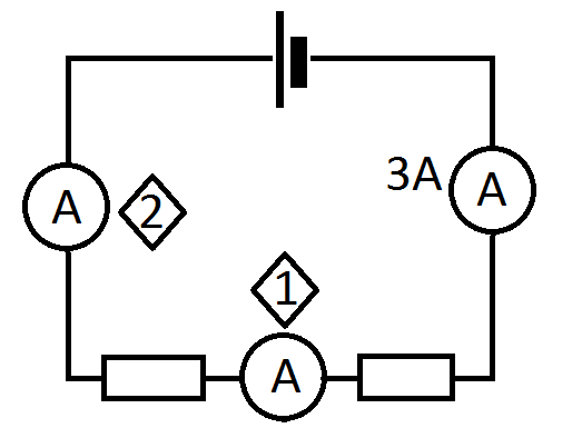 The current at 1 is 3A and the current at 2 is 3A.