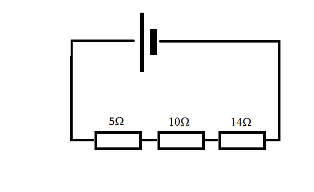 In the example the resistance = 5 + 10 + 14 = 29Ω