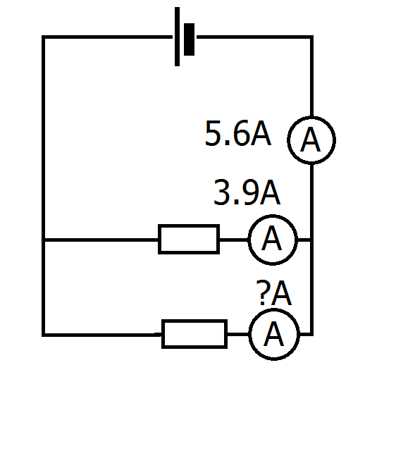 Example: in this circuit the total current is 5.6A and the current in one of the branches is 3.9A. this means the current in the other branch must be 5.6-3.9 = 1.7A