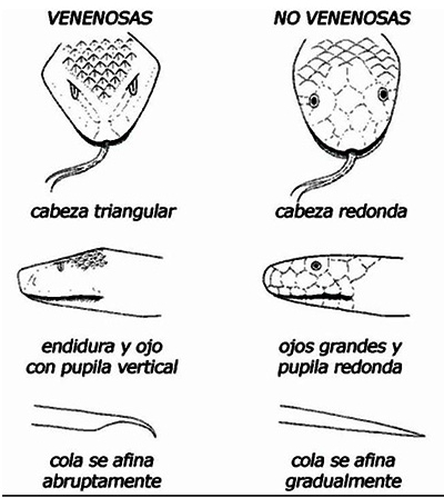 NO VENENOSAS: pupila ovoide, cabeza alargada, escamas grandes, colores no geometricos, cola larga y delgada, no tiene foseta loreal, no tiene dientes inoculatorios. Ej: culebras, boas