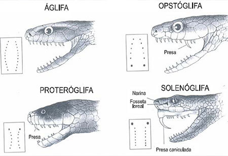 VENENOSAS: pupila eliptica, cabeza triangular, escamas pequeñas, colores geometricos, cola torta y gruesa, tiene foseta loreal y dientes inoculatorios. Ej: yarara, cascabel.