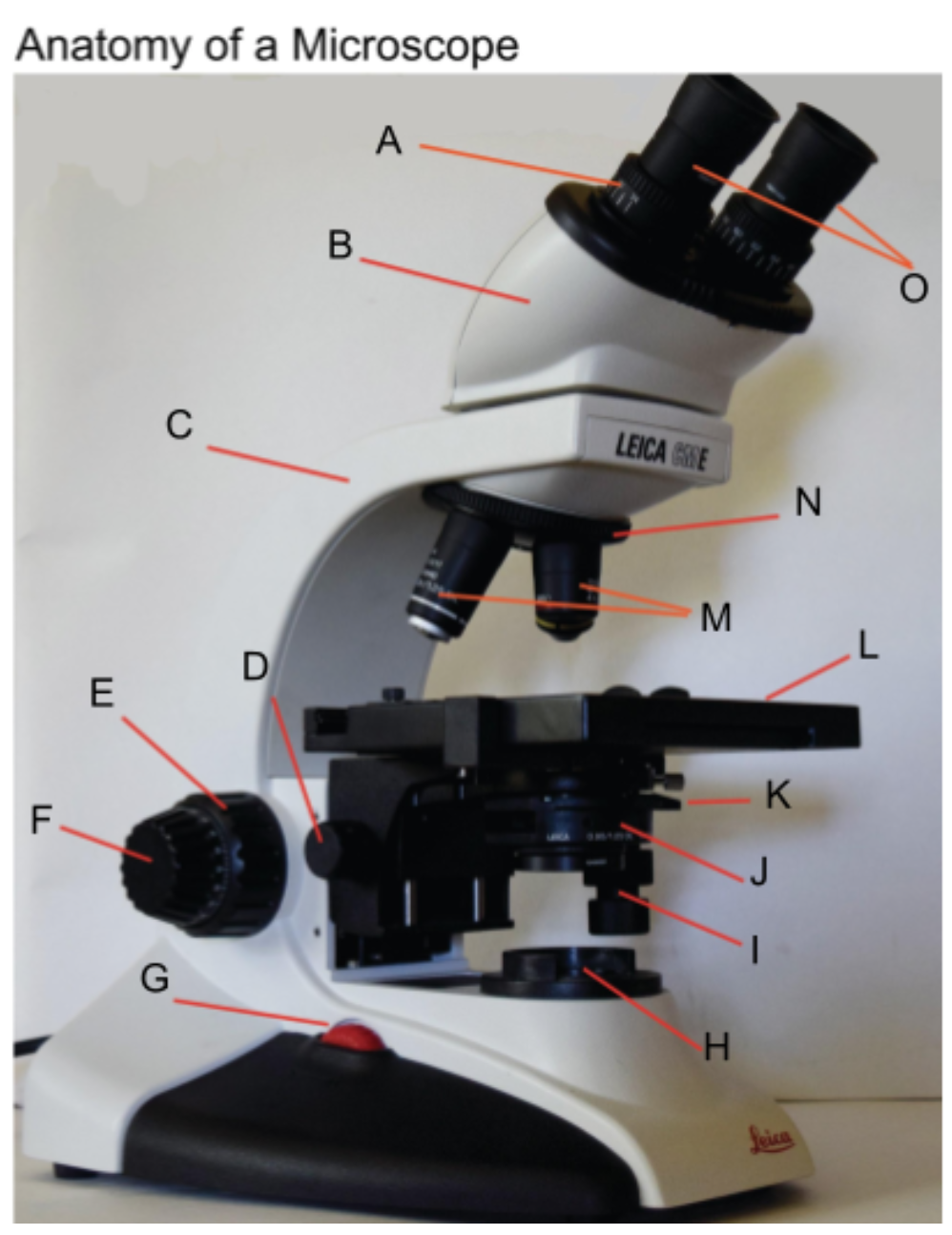 Houses lamp and brightness control, “backbone” that connects the the head- and nosepiece all the way to the bottom of the microscope.