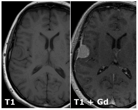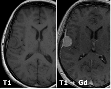 A meningioma of the right hemisphere deriving from meningiothelial cells.
