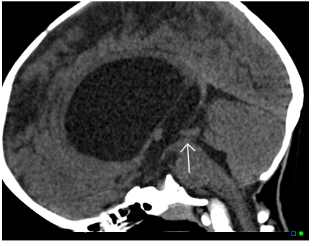 The arrow is pointing to part of the ventricular system which is narrowed.