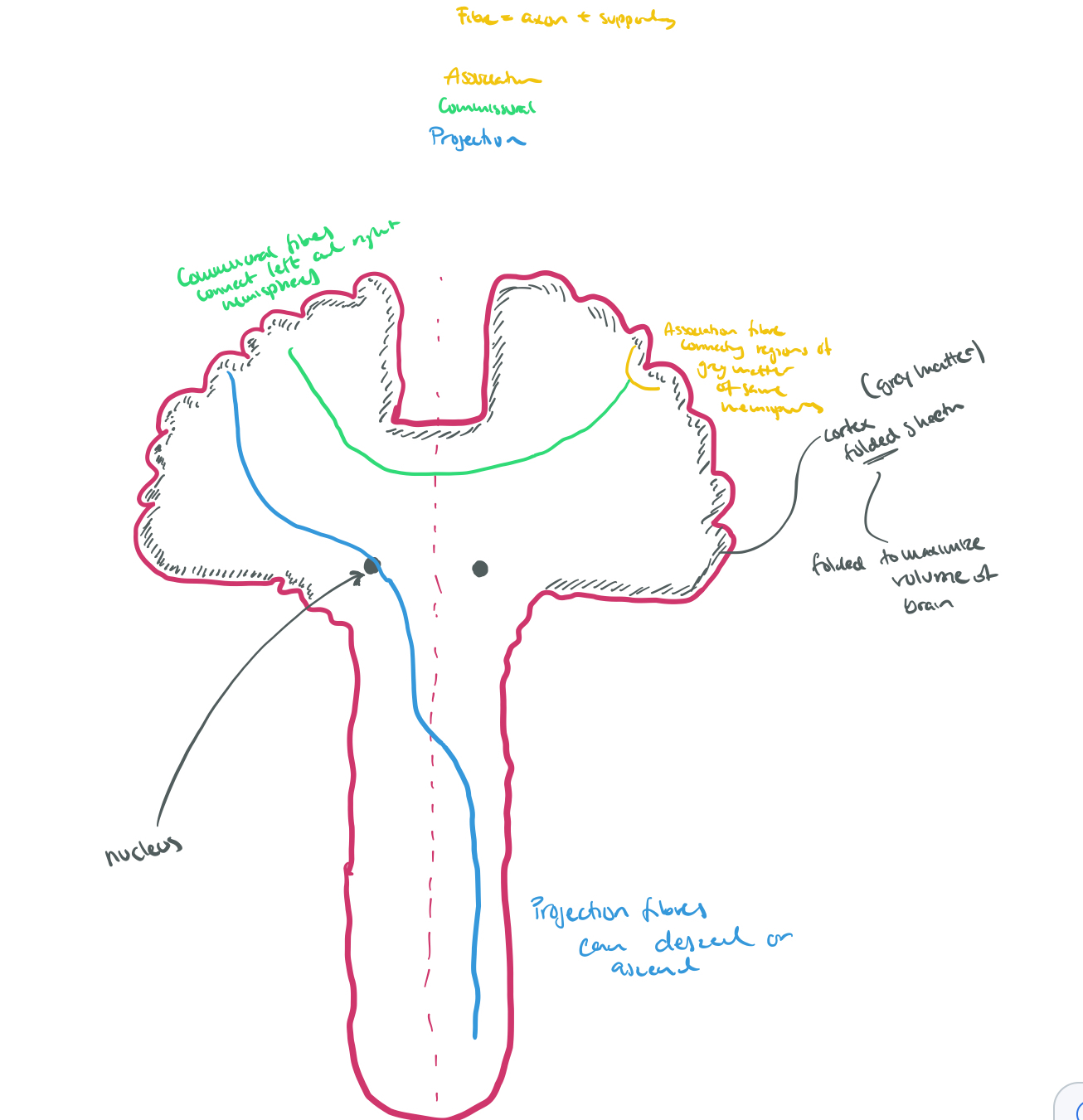 Grey matter is at its core and whiter matter is found as an outer shell.