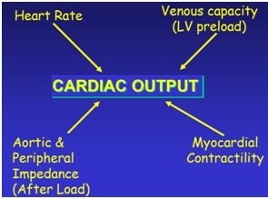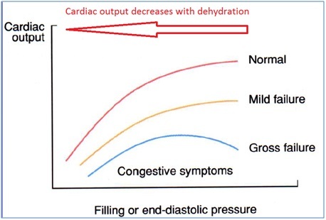 With gross failure, you get reduced CO as end diastolic pressure increases; there is a narrow margin between dehydration (decreases CO) and overfilling (also decreases CO). This is important for management.