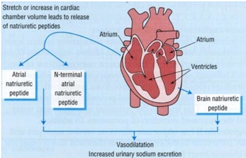 Stretch or increase in cardiac chamber volume leads to release of natriuretic peptides: predominate renal action – constricts afferent and vasodilates efferent arterioles. Vasodilatation increases urinary sodium excretion