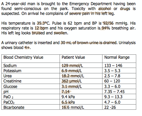 Metabolic acidosis because of the breakdown of muscle in his left leg leading to lactic acidosis. Also renal failure leading to a failure to reabsorb bicarbonate.
