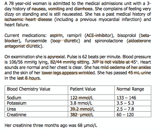 A - high serum urea (low volume leads to more Na+ reabsorbed and therefore less urea that is being secreted)