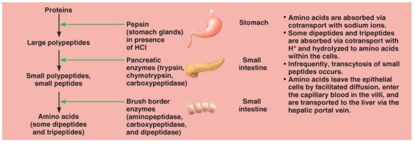 How does Absorption occur of Amino Acids and Dipeptides into epithelial cell (of small intestine) and how do they move out into blood?
