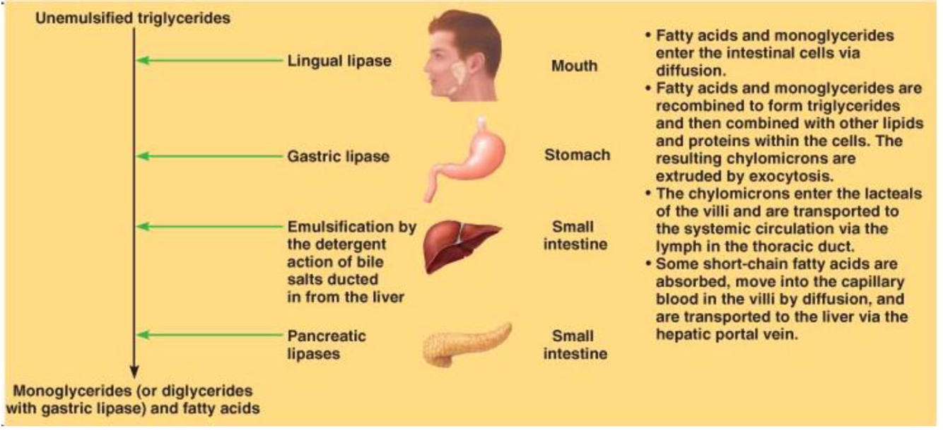 oTriglycerides are broken down into long/short chain fatty acids and monoglyceridesfor absorption