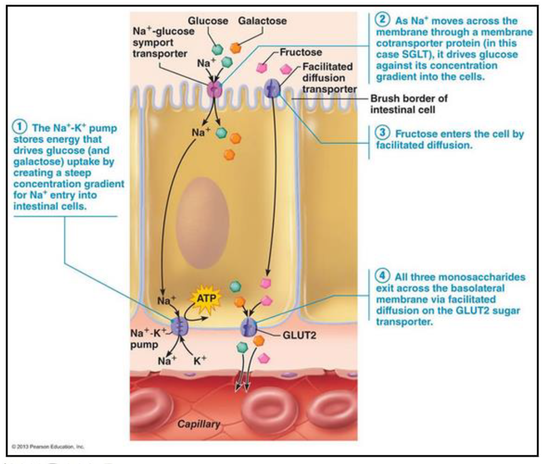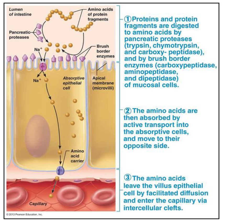 How are they absorbed into the epithelial cell and how do they move out of the epithelial cell into the bloodstream?