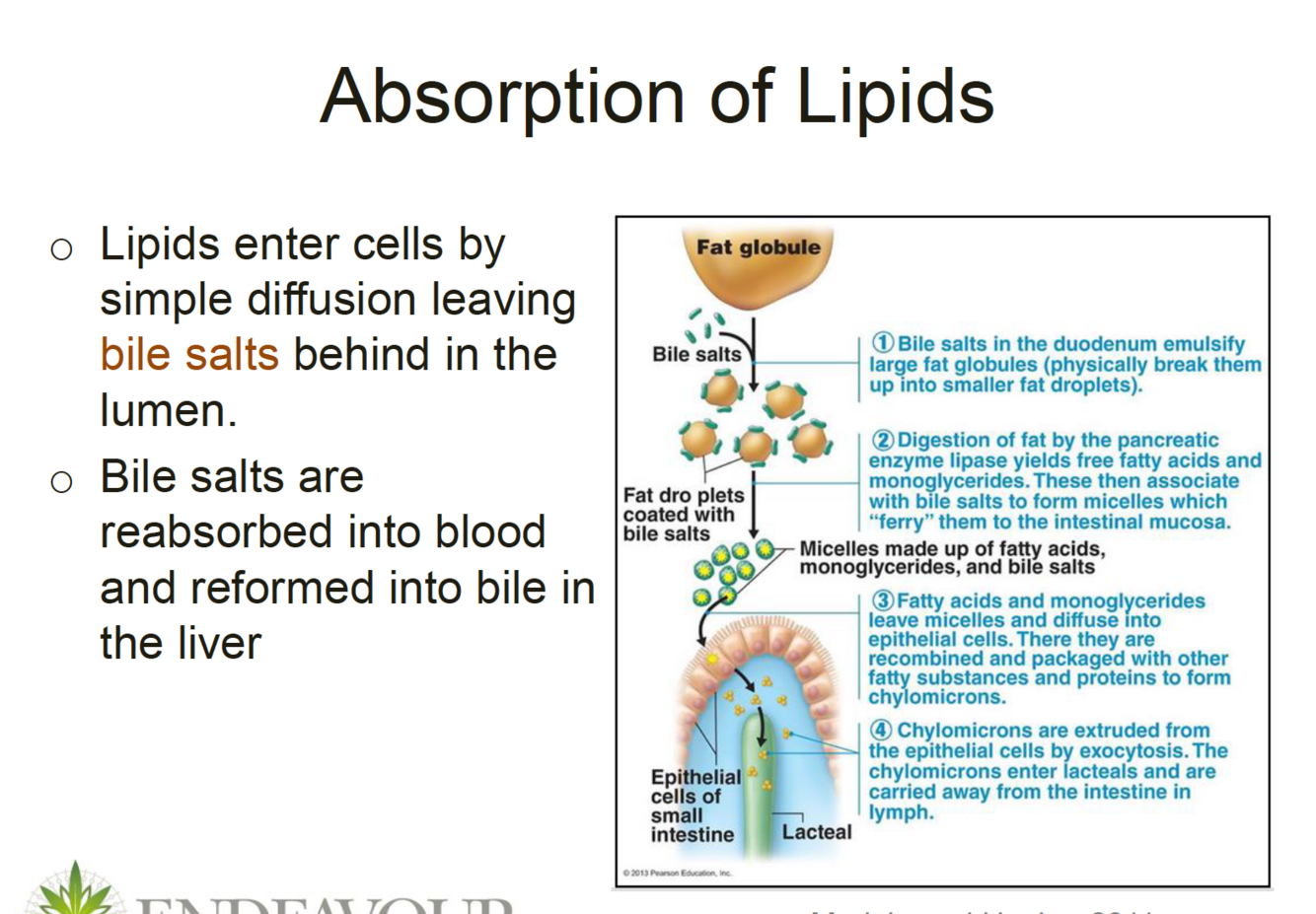 Extra info ** They are absorbed as part of micelles - when the lipids are in the gut and they have been emulsified by the bile they form these little structures called micelles and when they move into the epithelial cell by simple diffusion, they then reassemble themselves into chylomicrons. That’s how they move out of the epithelial cell.