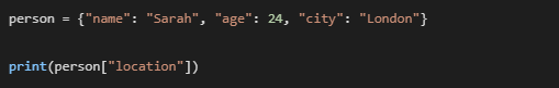 The above code snippet attempts to print the location of the person. Identify the error and suggest a quick fix. In addition, suggest a general way to handle missing keys in a dictionary so that the code does not produce an error. - (3)
