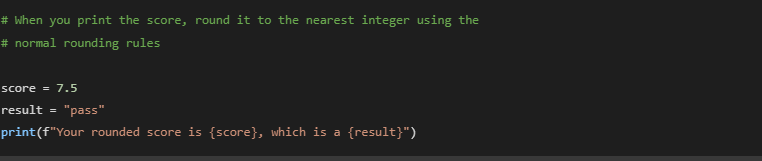 print(f”Your rounded score is {score:2.0f}, which is a {result}”)