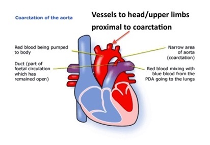 Because the vessels in the head and upper limbs usually emerge proximal to the coarctation, the blood supply to these regions is not compromised. However blood flow to the rest of the body is reduced.