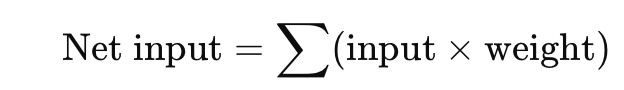 inputs go into a propagation function that calculations the net input, then a transform cuntion calculates an activation level, then we reieeve an output