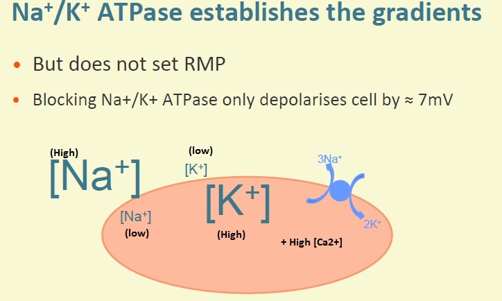 Blocking the Na+/K+-ATPase only depolarises cell by approximately ~7mV.