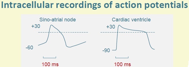 Draw the changes in membrane potential of cardiac ventricular and sinoatrial node pacemaker cells, including time durations