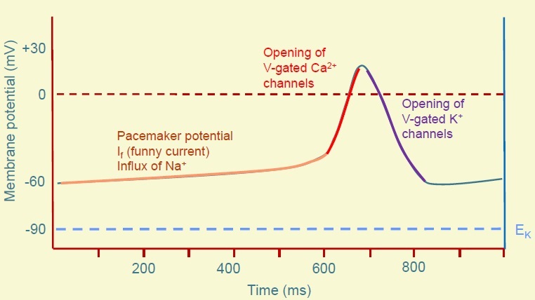This is thought to be due to the HCN channels that are permeable to Na+ ions which are different to the fast Na+ channels - they are activated by Hyperpolarization, referred to as the funny current. Pacemaker cells do not have fast Na+ channels but as the membrane depolarises with the pacemaker potential, voltage gated Ca2+ channels eventually open producing a faster rate of depolarisation to a positive membrane potential.
