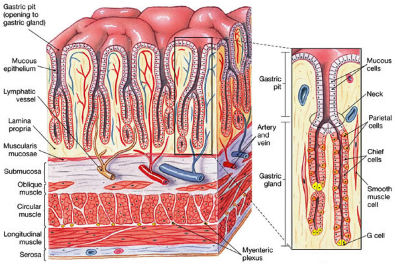 [*] Gastric pits contain Neck cells, and gastric glands containing Parietal, Chief and G-cells along with smooth muscle cells