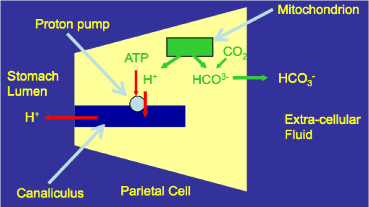 [*] Most body fluids are slightly alkaline so if H+ ions are to be secreted, they must be first created in quantity. This happens at numerous mitochondria in parietal cells by, in effect, splitting water, which also generates OH- which then combines with CO2 from metabolism to form HCO3-, which is exported to the blood.