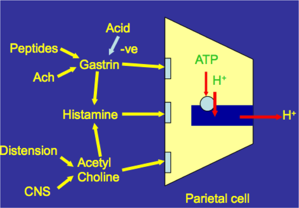 Acid and enzyme secretion is controlled by a complex of neural and endocrine systems. Parietal cells are stimulated by ACh (Acetylcholine), Gastrin and Histamine which act through separate receptors to promote acid secretion.