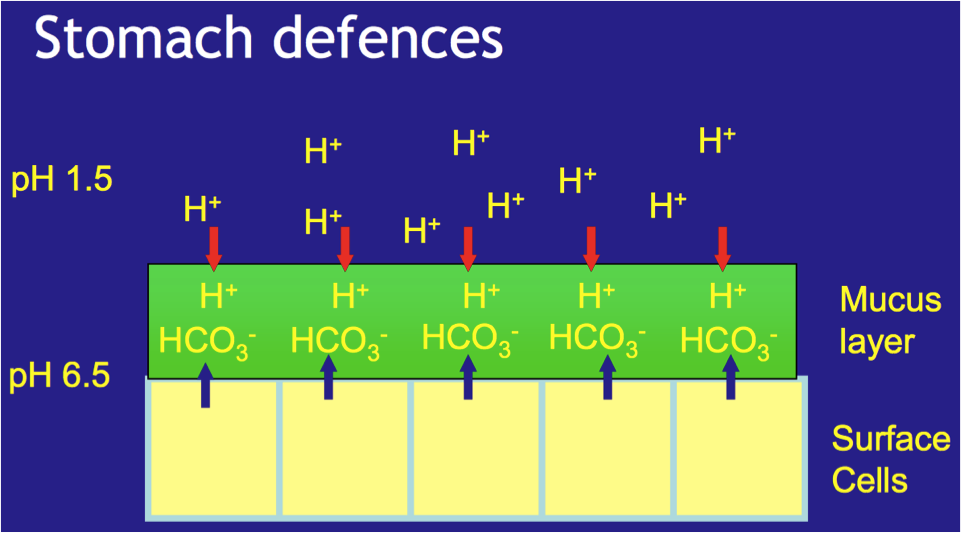 [*] Defences are damaged by infection with H Pylori by excess alcohol ingestion, and by non-steroidal anti-inflammatory drugs which inhibit prostaglandin production.